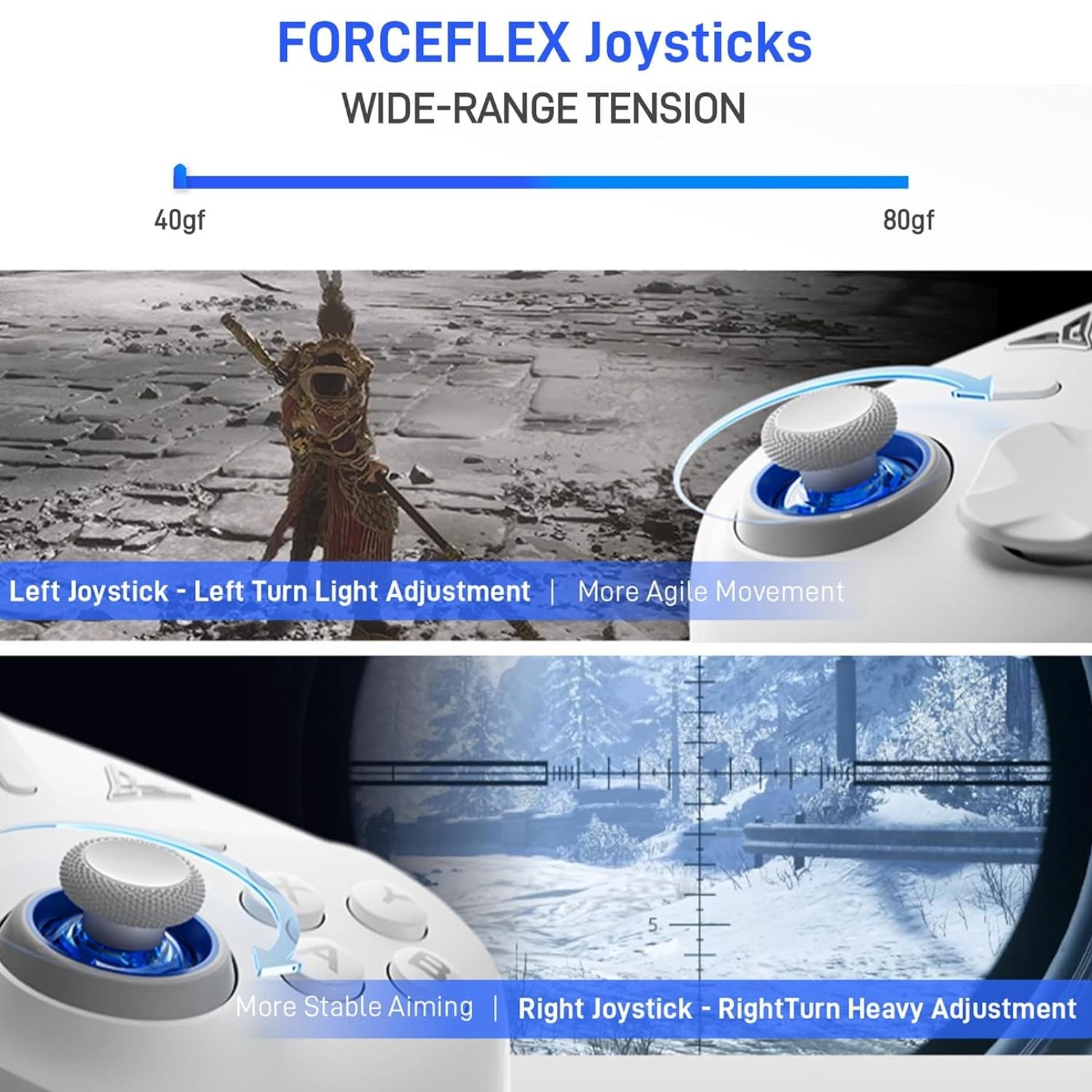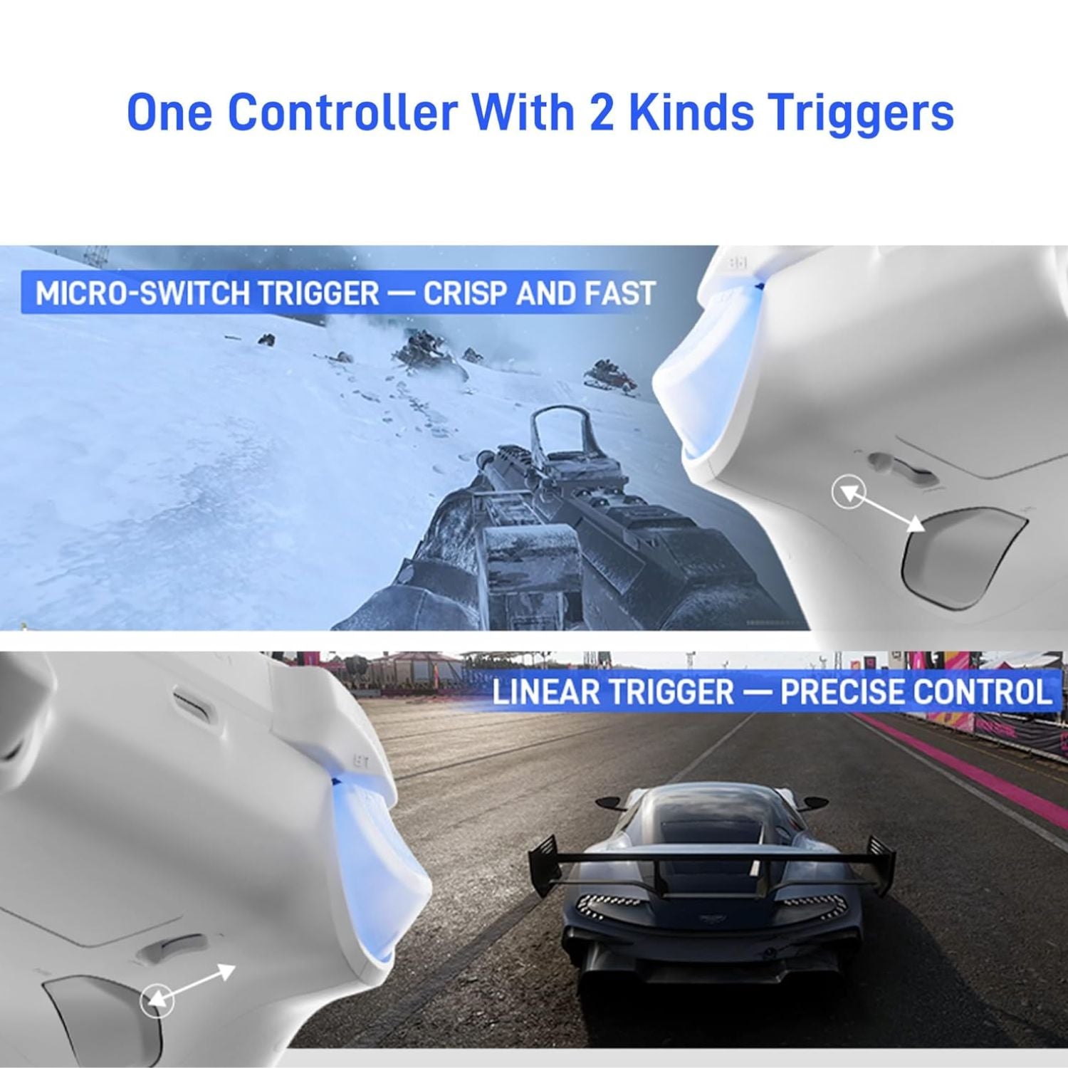 - Gatilhos vibratórios com força ajustável: Vibração adaptável com resposta tátil realista e sensibilidade configurável.