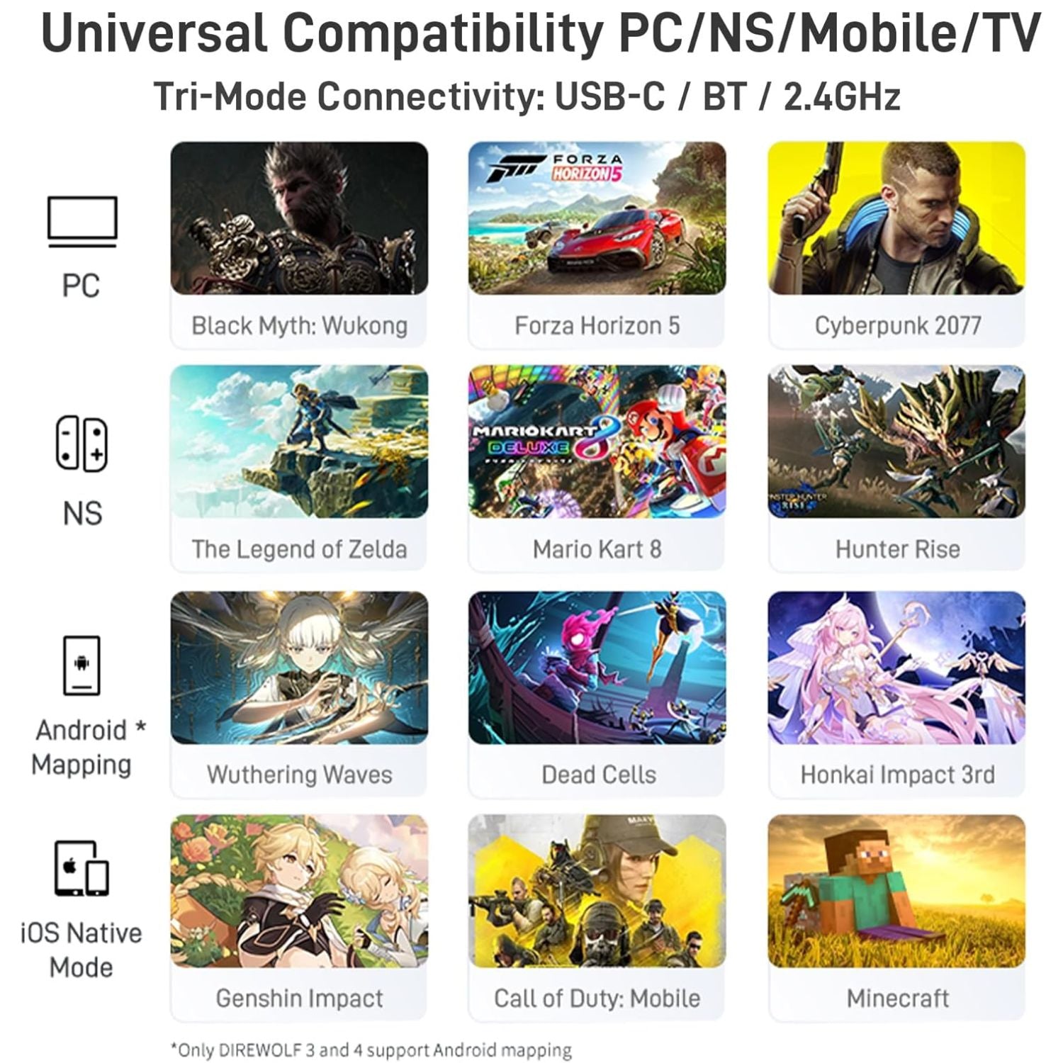 O Direwolf 4 é compatível com Windows 10 e 11, Nintendo Switch, dispositivos Android e iOS. Ele pode ser utilizado via dongle USB 2.4GHz, Bluetooth ou cabo USB, oferecendo flexibilidade para jogar em diferentes plataformas.