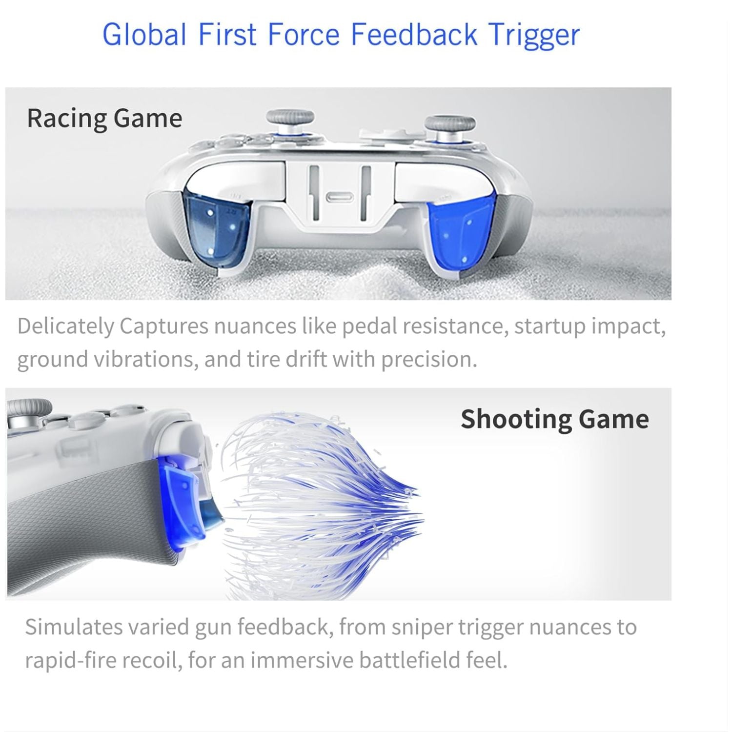 Os gatilhos utilizam tecnologia Hall com force feedback, proporcionando sensação tátil realista. Em jogos de corrida, a aceleração é progressiva. Em jogos de tiro, o retorno do disparo é mais consistente e imersivo.