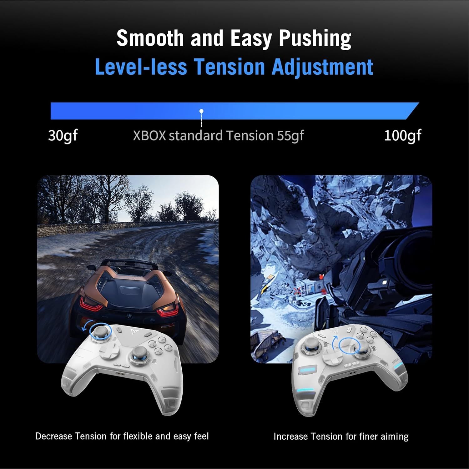 O Apex 4 utiliza joystick Alloy Hall com resistência ajustável, permitindo adaptar a tensão conforme seu estilo de jogo. O sistema Hall reduz desgaste mecânico e ajuda a prevenir drift, oferecendo maior durabilidade e precisão consistente.